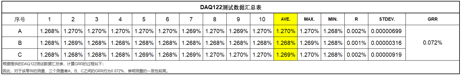 Ut delectus notitia acquisitionis chartae metus occurrat, ille ME turma probata est. Analysis ostendit delectum schedulae acquisitionis optimam stabilitatem habere, cum GRR circiter 0.072% inter tres mensores A, B, C.